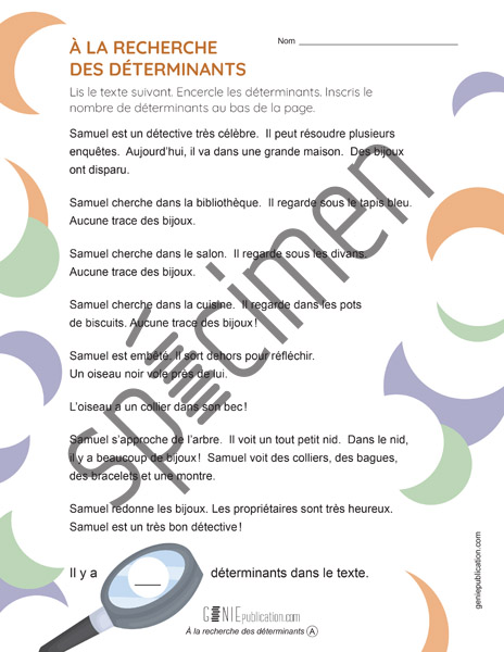 L’élève doit identifier les déterminants dans un texte d’enquête et indiquer leur nombre.