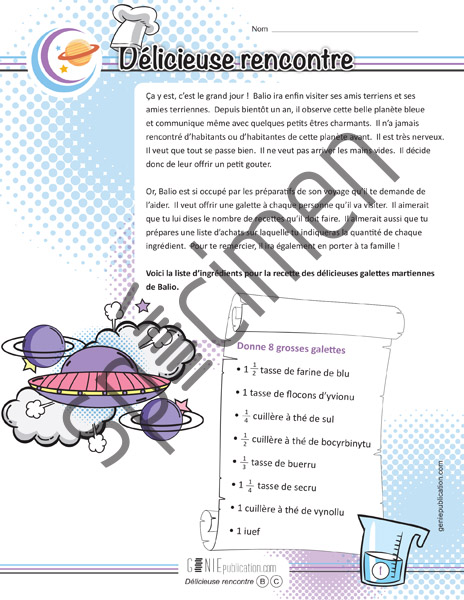 Situation d'application dans laquelle l'élève doit déterminer la quantité de galettes et d'ingrédients nécessaires pour sa visite sur Terre.