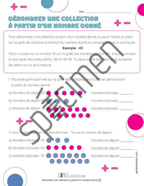 À partir d’un nombre donné, l’élève doit trouver un nombre en ajoutant ou en enlevant des jetons.