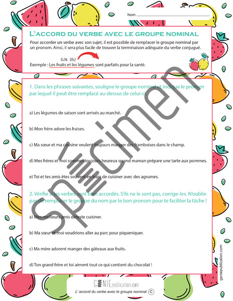 L’élève doit identifier le groupe nominal et le remplacer par le pronom adéquat puis corriger le verbe s’il y a lieu.