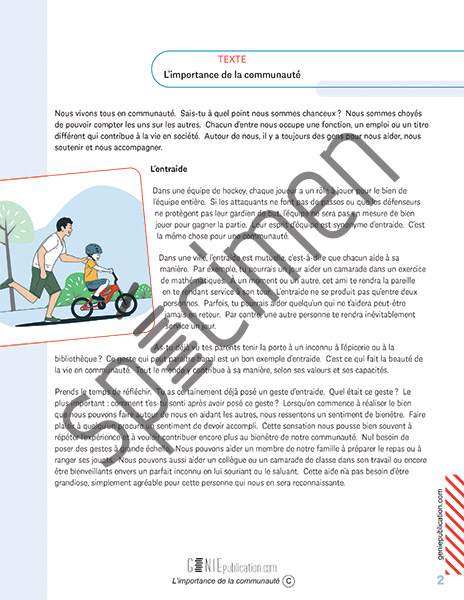 L’importance de la communauté est un texte de 2 007 mots suivi de 12 questions (questions à choix multiples, d’ordonnancement, à réponse courte et à réponse élaborée). Cette activité a été conçue selon le modèle des épreuves et présente un cahier de l’élève (comprenant le texte L’importance de la communauté et un cahier de réponses) ainsi qu’un cahier de l’adulte responsable (comprenant le corrigé).