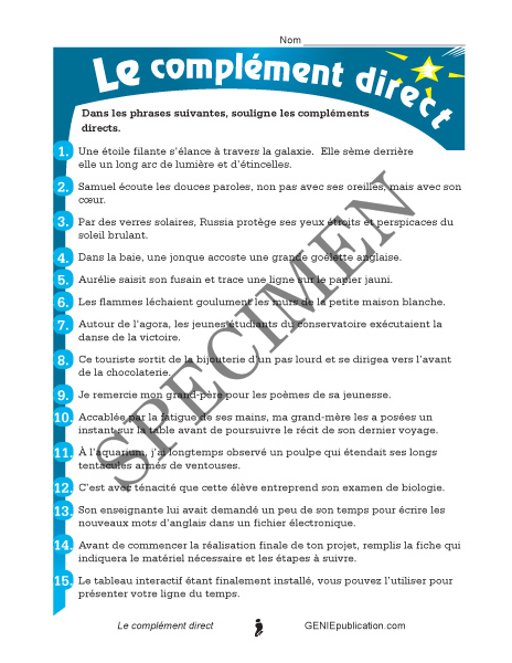 Dans cette activité, l'élève trouve les compléments directs dans les phrases.