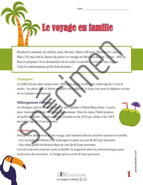 Situation-problème dans laquelle l’élève doit calculer le cout total d’un voyage au Mexique en complétant des additions et des multiplications de couts simples.