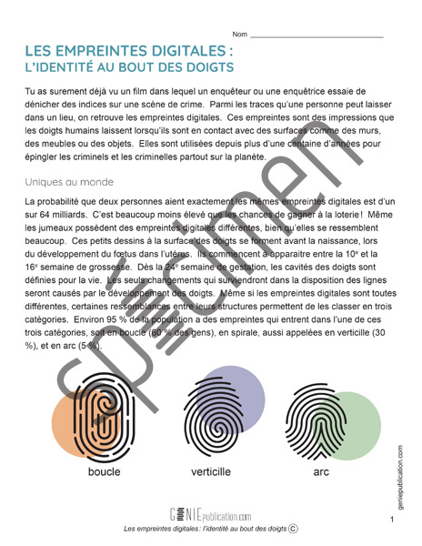 L’élève doit lire un texte sur les empreintes digitales et répondre à des questions.