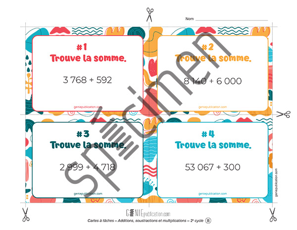 Cartes à tâches – Additions, soustractions et multiplications – 2e cycle