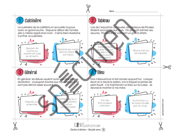 L’élève doit lire le court paragraphe de la carte et déterminer le sens du mot de la carte.