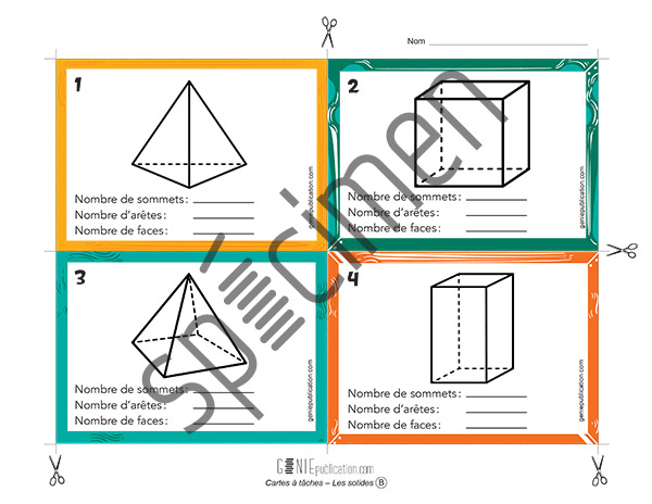 Cartes à tâches sur l’identification des solides et de leurs spécificités : nombre de faces, d’arêtes et de sommets.
