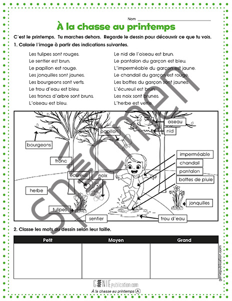 L’élève doit colorier une illustration selon les couleurs indiquées, puis classer les différents éléments de l’image par catégories selon leur taille.