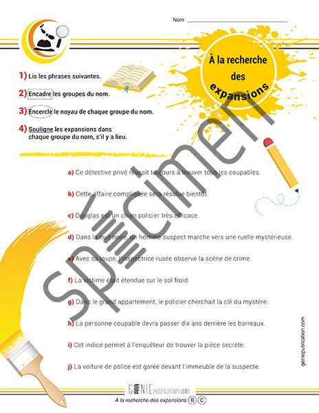 L’élève doit identifier le groupe du nom, le prédicat et l’expansion dans chacune des phrases de l’exercice.