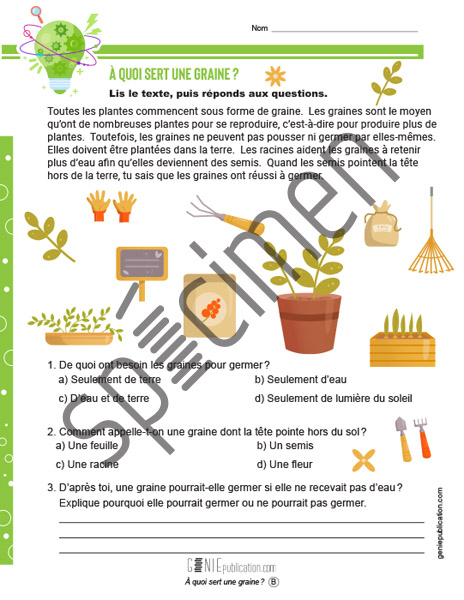 L’élève lit un texte sur les graines, puis répond à des questions.