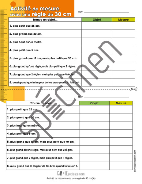 Activité de mesure dans laquelle les élèves doivent trouver des objets de différentes tailles dans la classe.