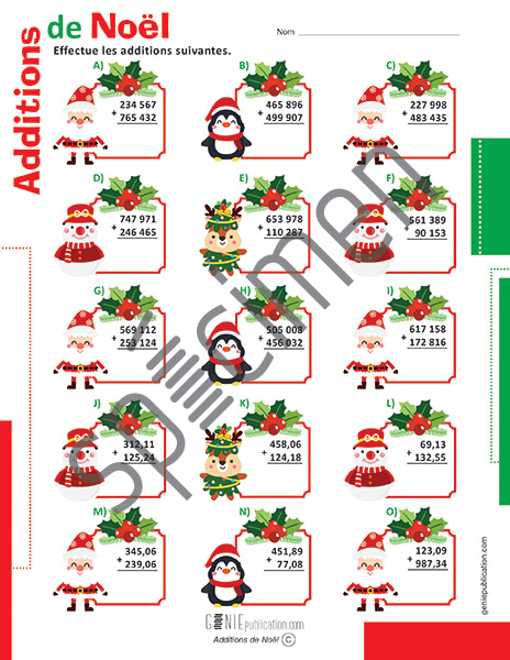L'élève doit effectuer des additions de nombres entiers et de nombres décimaux.