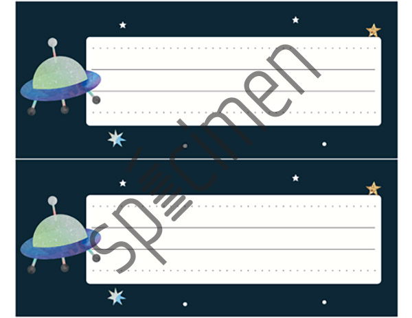 Quatre modèles d’affiches de nom pour les pupitres sous la thématique de l'espace.