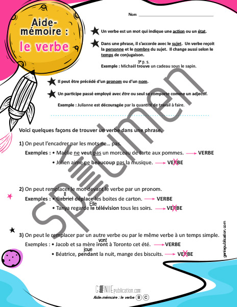 Ce document est un aide-mémoire au sujet du verbe. Il aide l’élève à identifier les verbes dans les phrases.