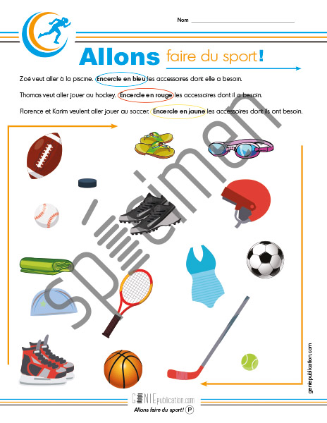 L'élève doit encercler le matériel nécessaire pour pratiquer chacun des sports demandés.