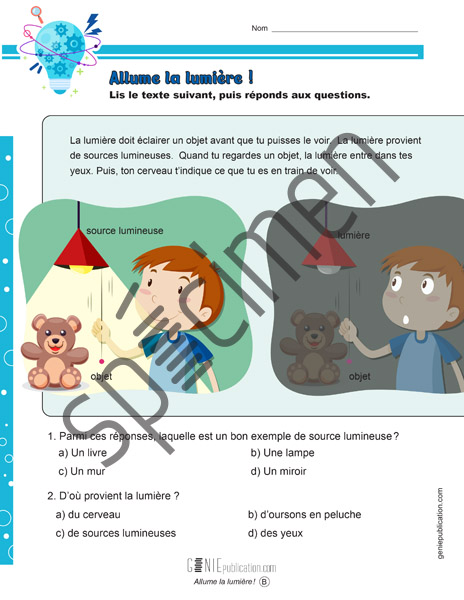 L’élève lit un texte et observe une illustration sur les sources lumineuses et le fonctionnement du sens de la vue puis répond à des questions.