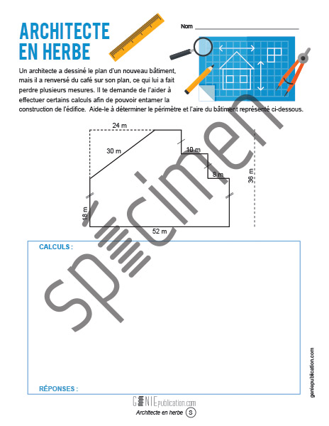 L'élève doit déduire les dimensions d'une figure plane décomposable, calculer le périmètre de la figure, décomposer la figure en formes géométriques plus simples et calculer l'aire totale.