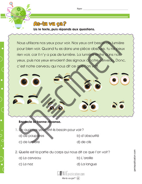 L’élève lit un texte sur la façon dont fonctionnent nos yeux et répond à des questions.