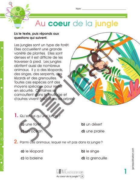 L’élève est invité à lire un court texte sur la jungle et à répondre à des questions sur les animaux qui y habitent.