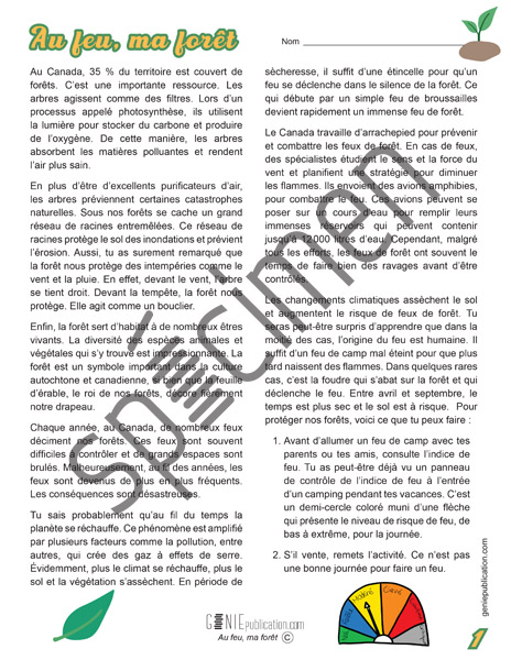 Ce texte présente ce que sont les feux de forêts, ce qui les provoque, mais aussi les actions posées pour les contrôler et les éviter. L’élève sera invité à répondre à des questions de repérage et d’inférence.