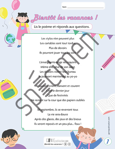L’élève lit un poème de 4 strophes sur le thème de la fin des classes et ensuite, répond à 10 questions (compréhension, repérage, inférence, réaction). La dixième question lui permet de laisser aller sa créativité en ajoutant une strophe au poème. Bonne fin d’année scolaire !