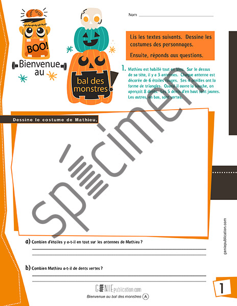L’élève doit lire une description de personnage, puis réaliser un dessin selon les indications du texte. L’élève doit ensuite répondre à des questions.