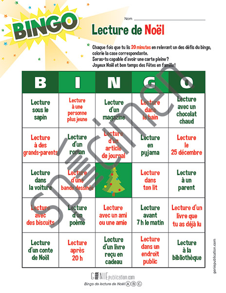 Pour chaque période de lecture avec l’un des défis du bingo, l’élève colorie la case correspondante. C’est une activité parfaite à laisser aux élèves pendant les vacances des Fêtes pour qu’ils intègrent la lecture à leur quotidien.