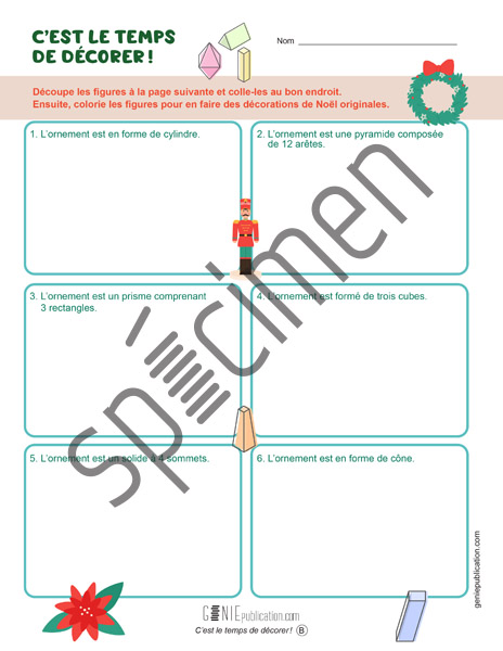 L’élève doit classer les solides sous la bonne description et les dessiner pour en faire des décorations de Noël.