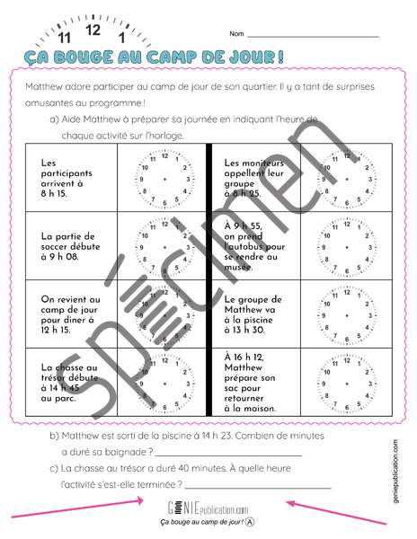 L’élève doit indiquer la bonne heure sur les horloges et dire combien de minutes a duré la baignade.