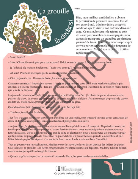 Pour son exposé oral, Mathieu présente les vers à composte qui vivent dans le « vermicomposteur » familial. Ce texte narratif présente des faits sur le vermicompostage avec un ton léger. L’élève pourra répondre à des questions de repérage et d’inférence. Il sera ensuite invité à imaginer le dénouement de l’histoire.