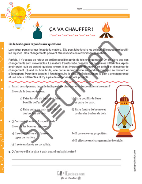 L’élève doit lire un texte sur les changements de la matière, puis répondre à des questions.