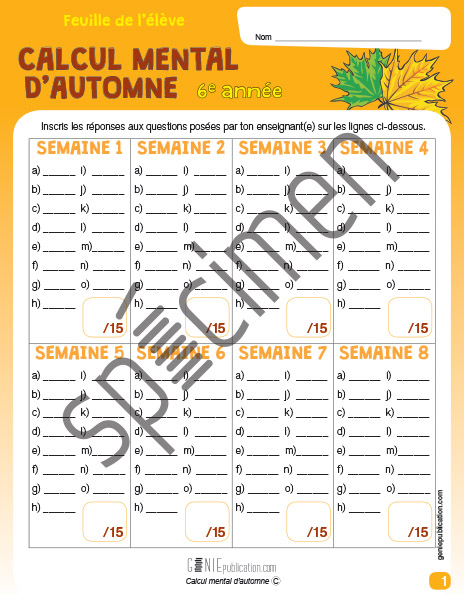 Ce document propose 8 séances de calcul mental comprenant 15 questions chacune.