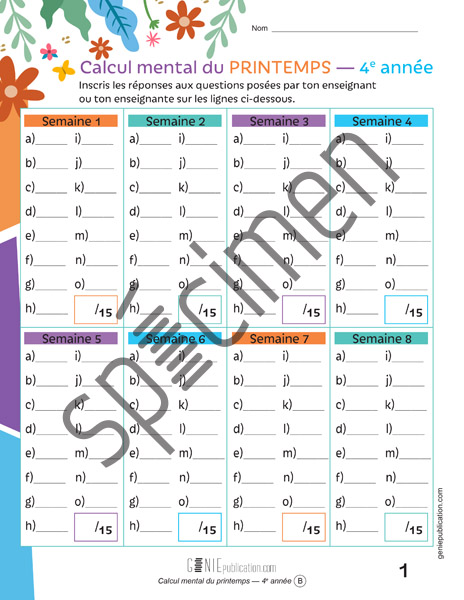 Ce document propose 8 séances de calcul mental comprenant 15 questions chacune.