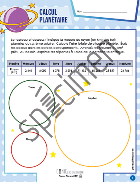 L'élève doit calculer l'aire totale de chacune des planètes du système solaire.