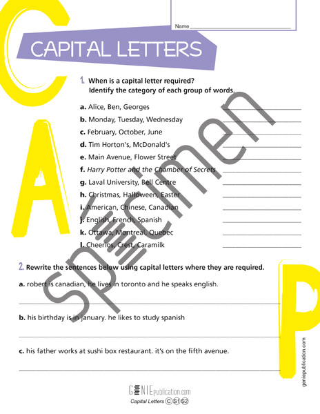 L'élève apprends les catégories des mots nécessitant une lettre majuscule et met cet apprentissage en pratique dans les phrases qui sont données.
