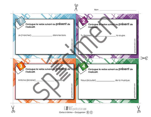 L'élève doit conjuguer des verbes au présent, à l'imparfait et au futur simple de l'indicatif. Il y a 60 cartes que vous pouvez mélanger afin qu'elles soient aléatoires.