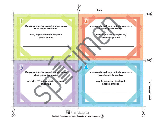 Ce document contient 40 cartes à tâches portant sur la conjugaison des verbes irréguliers.