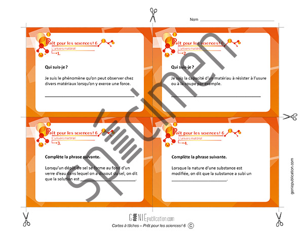 Cet ensemble contient 52 cartes à tâches. Elles sont basées sur la matière présentée dans Prêt pour les sciences ! 6 et conçues pour réviser les notions qui y sont présentées.
