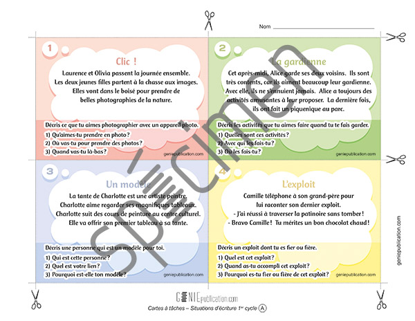 Cette série de cartes à tâches contient 28 situations d'écriture. La première partie de chaque carte présente une mise en situation, un contexte ou une tâche à accomplir. La deuxième partie précise des questions pour aider l'élève à développer ses idées.