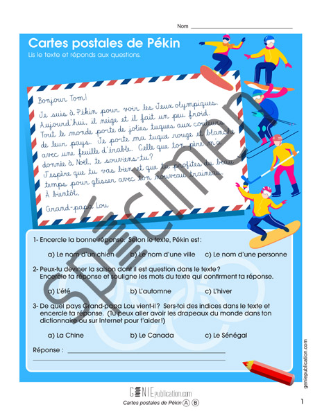 L’élève lit les cartes postales et répond à des questions. Cette activité permettra également à l’élève de travailler sa lecture de l’écriture cursive. Un beau défi de lecture pour vos élèves !