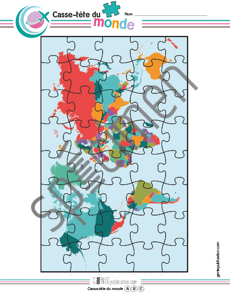 Casse-tête représentant la carte du monde. L'enseignant ou l'enseignante peut l'imprimer sur du papier cartonné et le découper afin que ses élèves puissent réaliser le casse-tête selon l'image fournie.