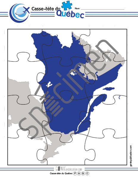 Casse-tête représentant la carte du Québec. L'enseignant ou l'enseignante peut l'imprimer sur du papier cartonné et le découper afin que ses élèves puissent réaliser le casse-tête selon l'image fournie.