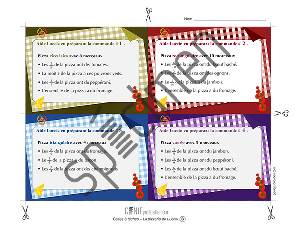 Cartes à tâches demandant à l’élève de dessiner des pizzas en suivant la forme géométrique demandée et les proportions requises selon les différentes garnitures.