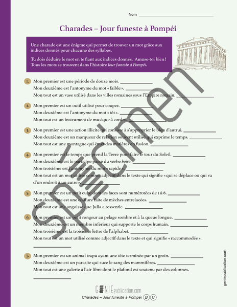 L'élève doit trouver la solution des charades après avoir lu le texte Jour funeste à Pompéi.