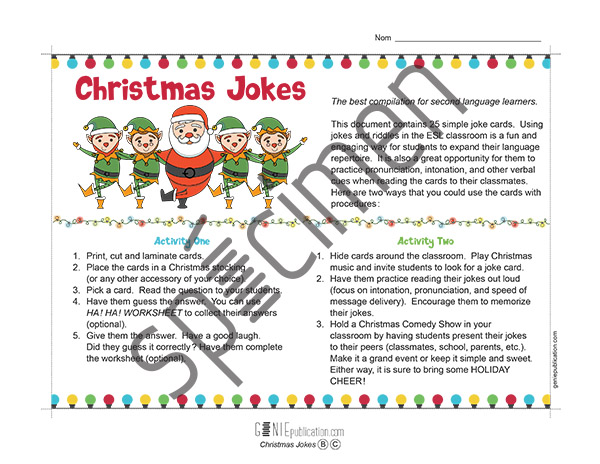 This document contains 25 simple joke cards. Using jokes and riddles in the ESL classroom is a fun and engaging way for students to expand their language repertoire. It is also a great opportunity for them to practice pronunciation, intonation, and other verbal cues when reading the cards to their classmates.