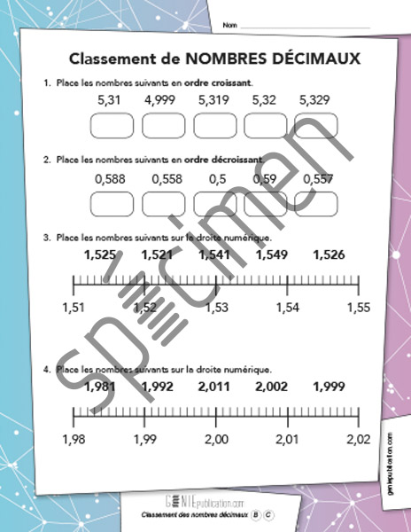 Activité pour placer des nombres décimaux en ordre et les positionner sur un axe gradué.