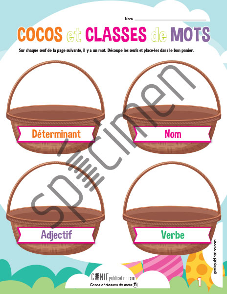 L’élève doit placer les œufs dans les bons paniers selon la classe du mot inscrit sur chaque œuf.