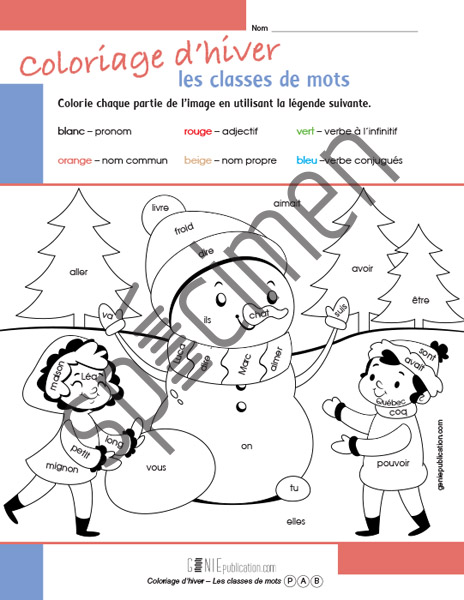 L’élève doit colorier les parties d’un dessin en utilisant les mots et leur classe de mots.