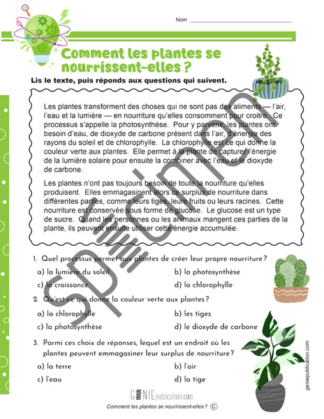 L’élève lit un texte sur la consommation et la production de l’énergie par les plantes, puis observe un diagramme qui illustre la photosynthèse. Il ou elle répond ensuite aux questions qui suivent.