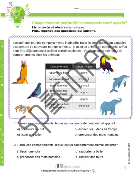 L’élève lit un court texte et observe un tableau avant de répondre aux questions qui suivent. Cette activité amène l’élève à différencier les comportements instinctifs des comportements appris chez les animaux.